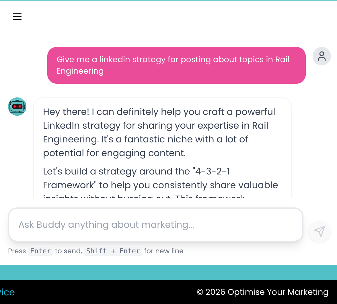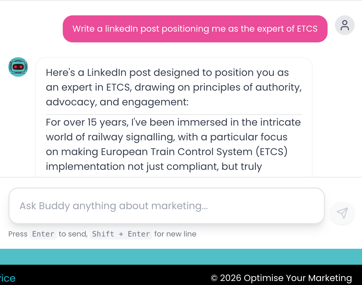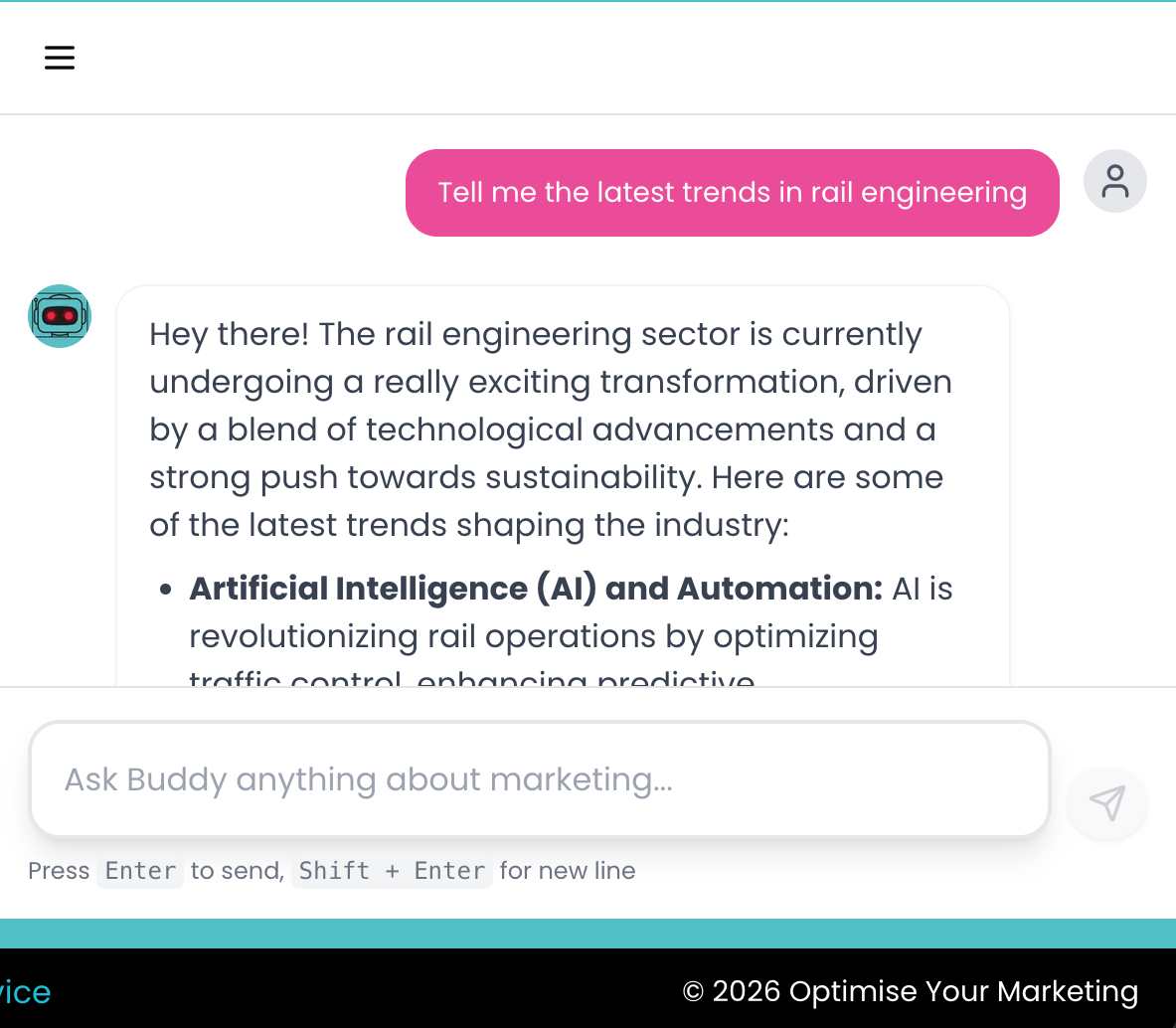 Buddy is a highly skilled Online Marketing assistant that is trained about Rail Engineering.