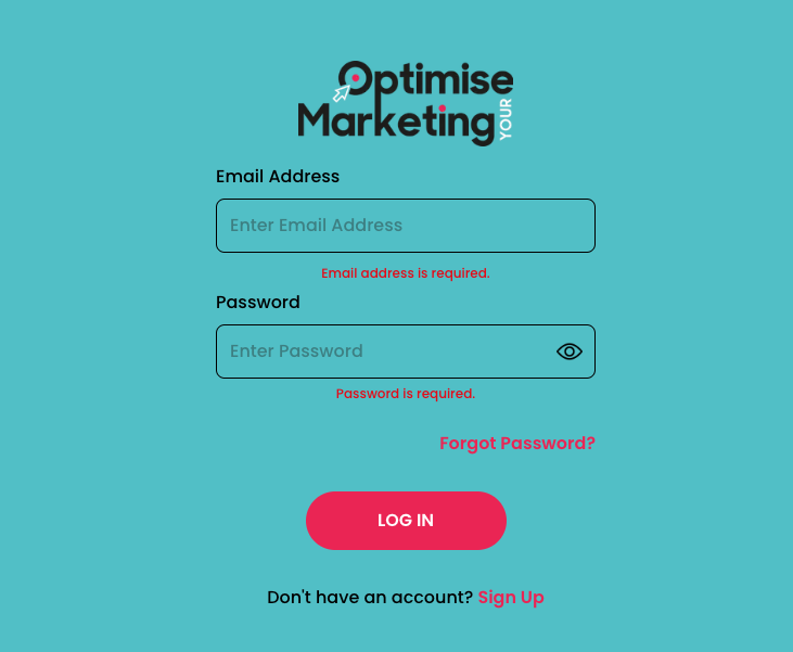 Visit https://app.optimiseyourmarketing.co.uk/login at anytime to access the login page to our Online Marketing Tool. If you have an account enter your Email and Password.